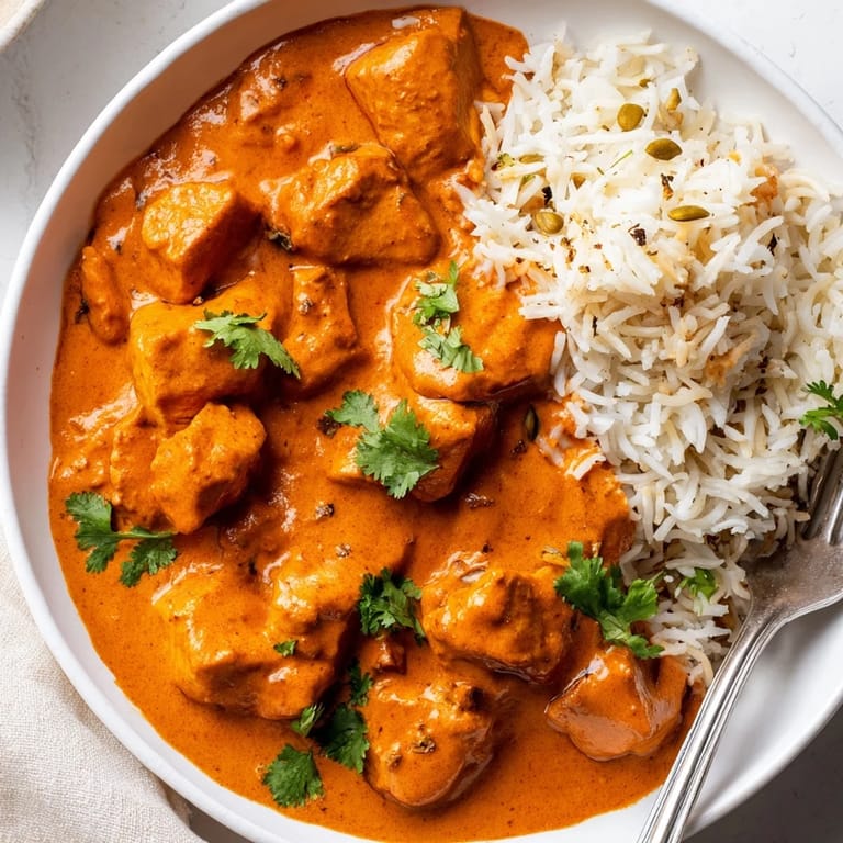Save A classic Indian favorite featuring tender chicken in a rich, creamy tomato sauce paired with fragrant basmati rice pilaf. Perfect for a comforting meal full of flavor and spice.