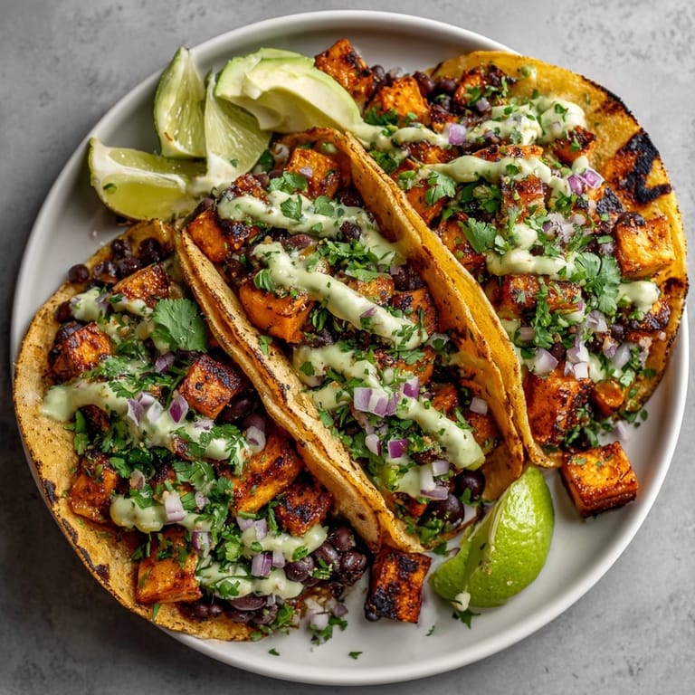 - Layer roasted sweet potatoes and black beans into each warm tortilla. Spoon over a generous swirl of avocado crema. Sprinkle with bright chopped cilantro and a handful of diced red onion. Serve immediately with lime wedges for a splash of tartness right before you dig in.