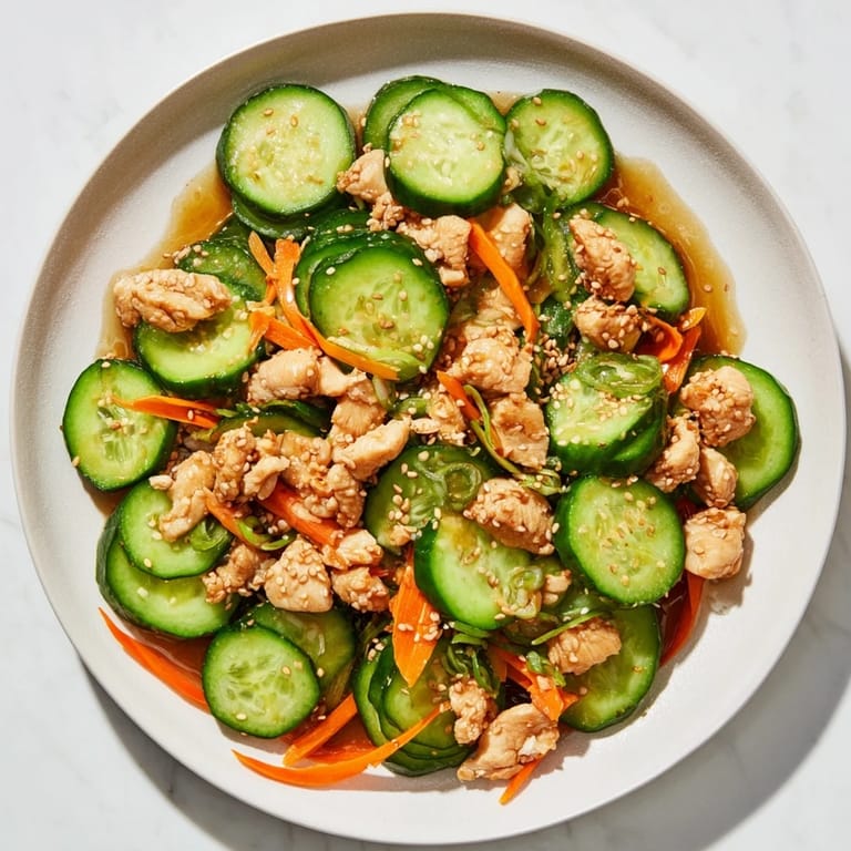 - Cucumber: Thinly sliced so it drinks up the dressing and stays crisp rather than getting waterlogged.
