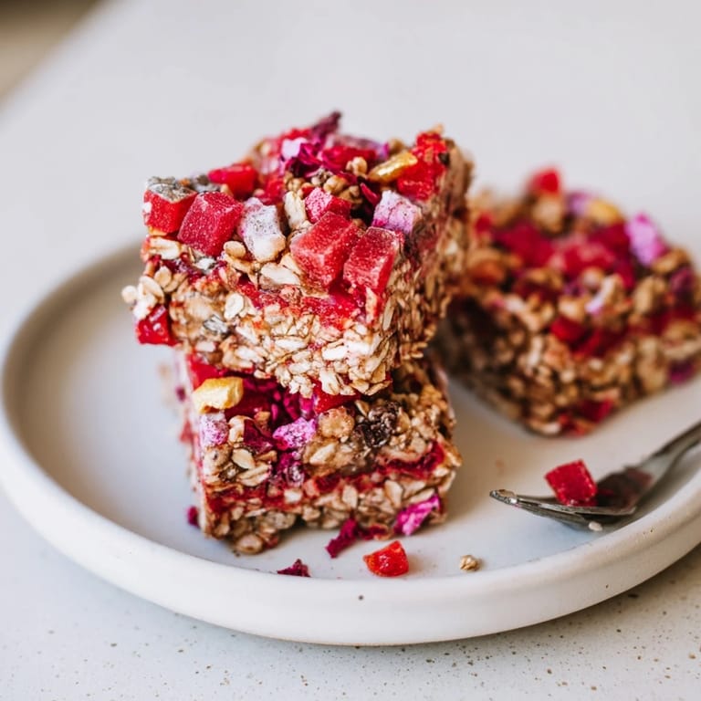 - Remove oat base from fridge. Top evenly with gummy cubes, freeze-dried fruit, and freeze-dried candy. Press gently.