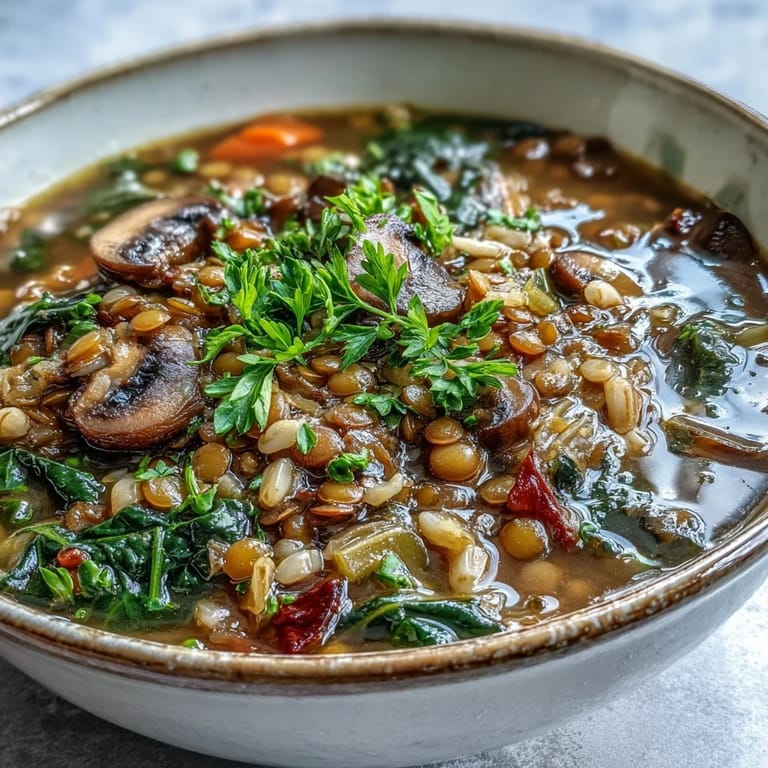 Save There's something about the sound of mushrooms hitting hot oil that makes me pause whatever I'm doing—that quick sizzle is like a tiny invitation to slow down. I developed this soup on a gray Tuesday when my fridge held the usual suspects: lentils in jars, a bunch of collard greens that needed rescuing, and mushrooms that were starting to wrinkle. What emerged was this impossibly filling bowl that felt less like cooking and more like assembling comfort.
