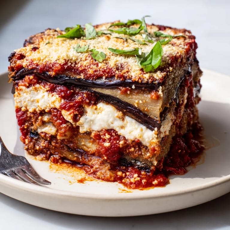 Save This lasagna brings the warmth of Italian-American comfort food right to your table. The eggplant slices are sweat-treated to reduce bitterness, then breaded and baked to golden perfection, adding a crispy yet tender bite. Homemade or store-bought marinara is simmered with garlic and herbs to create a luscious sauce base that ties every layer together. After baking, the bubbly, golden crust melts in your mouth, making every slice a delight.