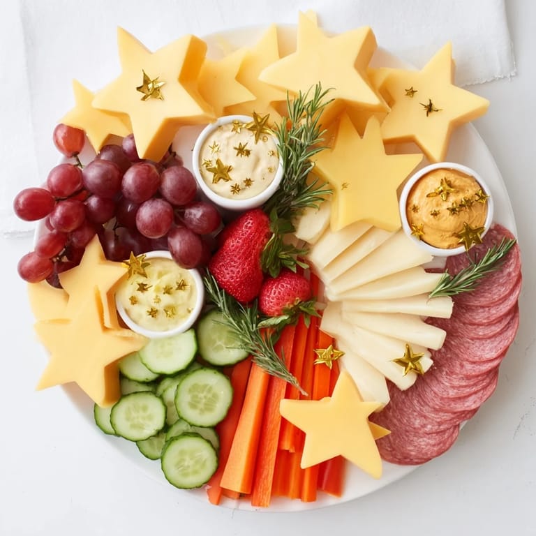 Arrange star-shaped cheeses and meats centrally to highlight shapes, then cluster fruits, vegetables, crackers, and dips around to balance colors and textures.