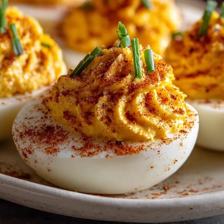 Save Jack-o'-Lantern Deviled Eggs bring festive cheer and a touch of whimsy to any Halloween table. These playful appetizers turn classic deviled eggs into charming mini pumpkins, boasting a creamy yolk filling, bright paprika dusting, and clever chive stems. They are a hit with kids and adults alike, making gatherings more memorable and delicious.
