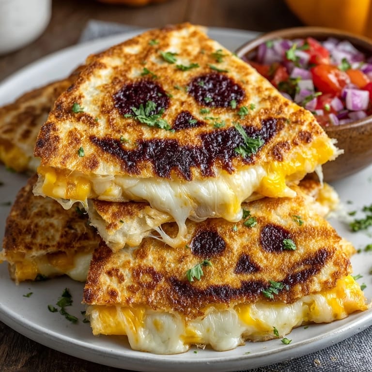 Save This festive Halloween-inspired quesadilla recipe transforms an everyday meal into something magical. The carved jack-o'-lantern faces create a spooky presentation that delights kids and adults alike, while the smoky pumpkin salsa adds seasonal flavor that elevates these quesadillas beyond ordinary fare.