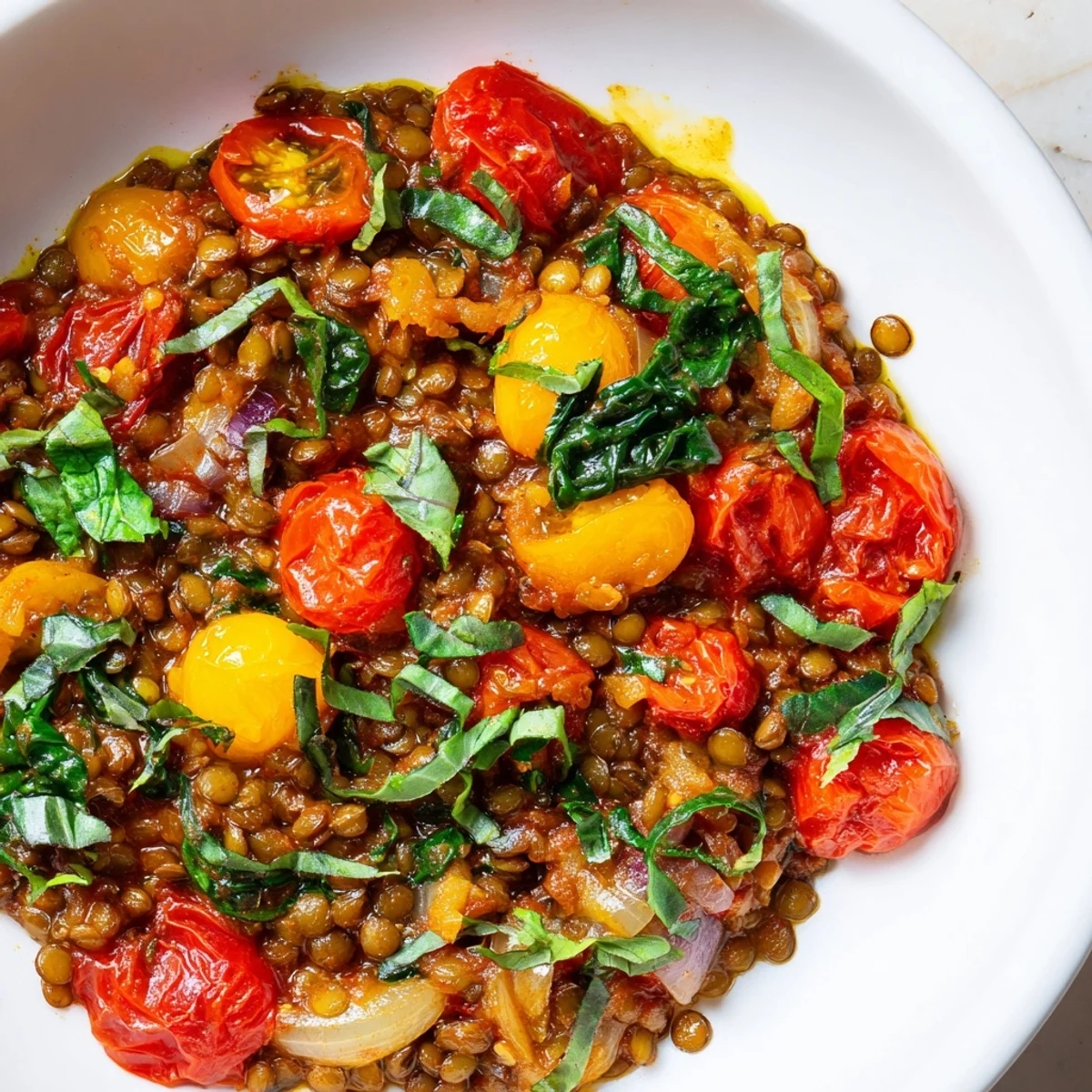 Save A hearty, one-pan vegetarian dish featuring tender lentils, juicy tomatoes, and a medley of fresh herbs for a vibrant, satisfying meal.