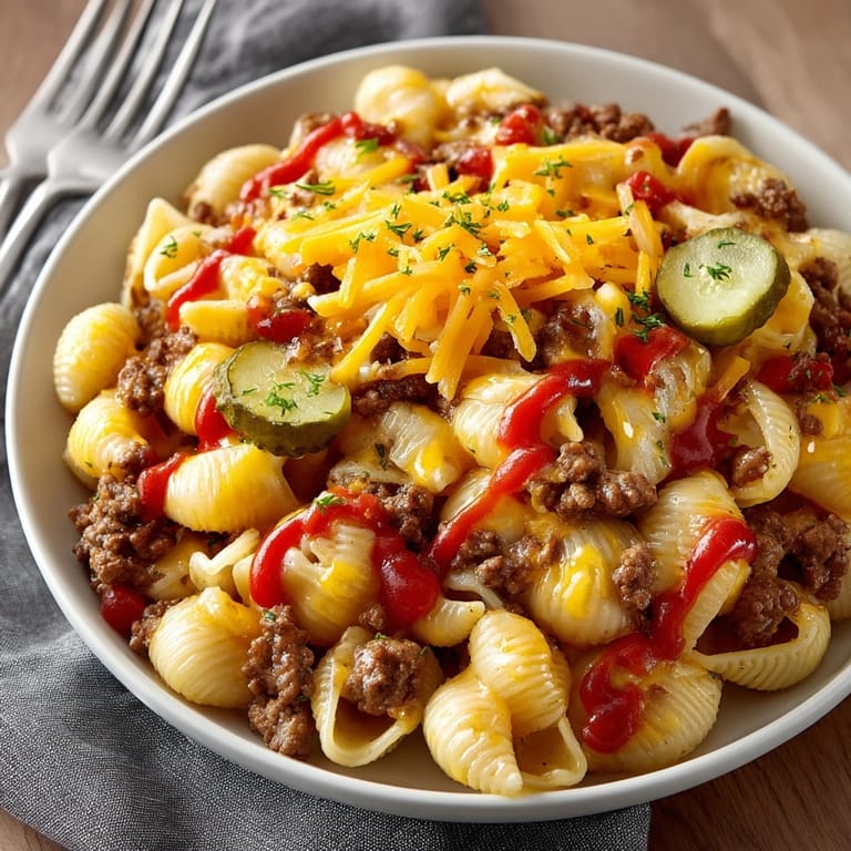 Save This loaded cheeseburger pasta skillet brings together all the best parts of a cheeseburger in one irresistible and easy dinner. We are talking hearty ground beef, gooey cheddar cheese, tangy pickles, and a savory, creamy sauce all mingling with tender pasta. It is a weeknight favorite when you want that satisfying comfort of a burger without firing up the grill.