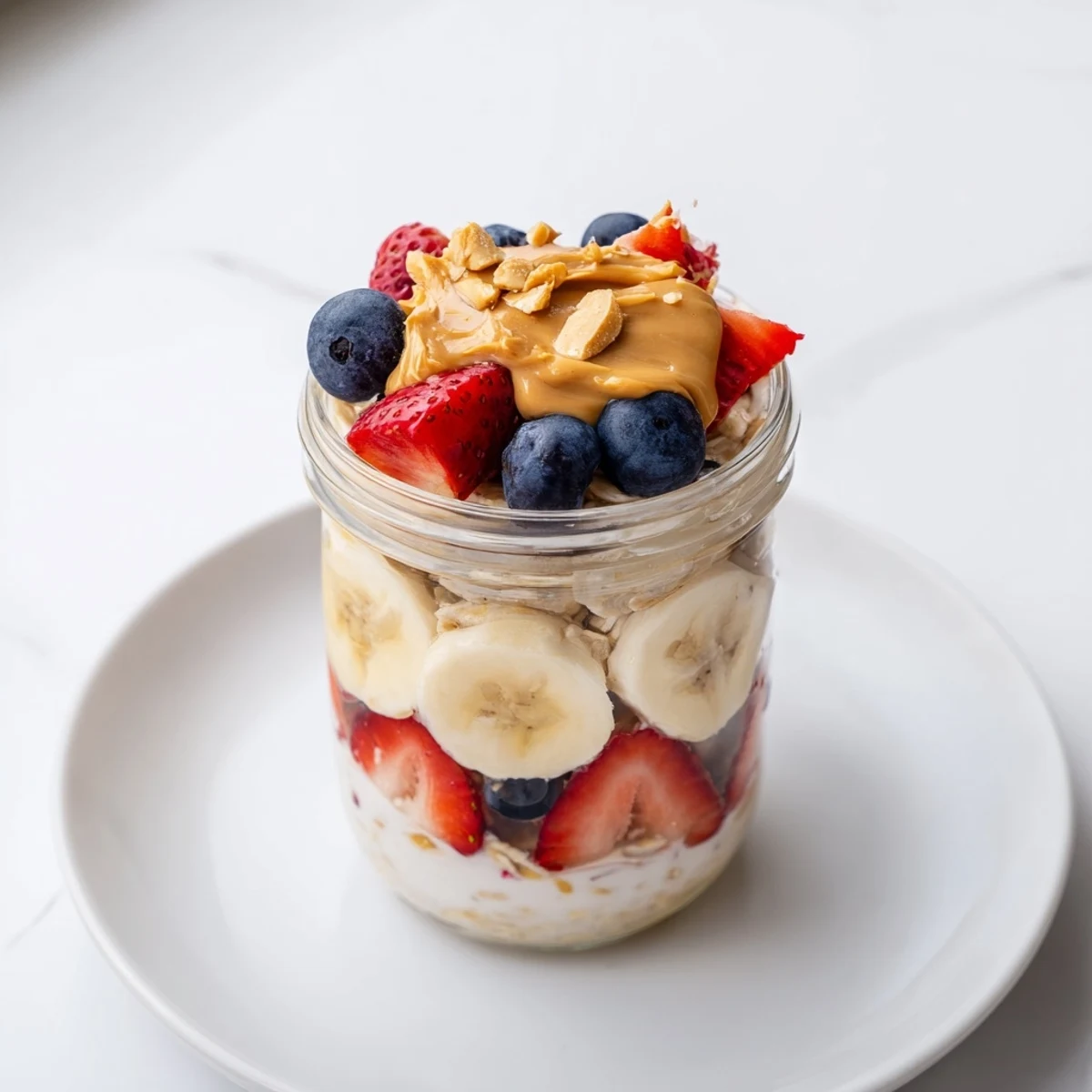 Save A creamy, nutritious breakfast featuring layers of oats, juicy fruit, and rich peanut butter, all prepared the night before for a quick and healthy start.