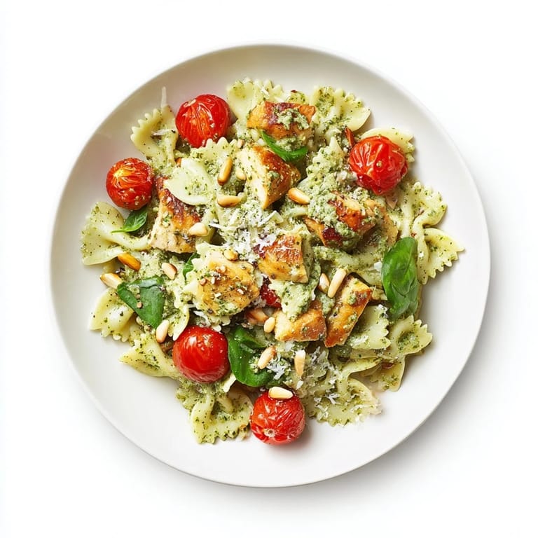 Save A vibrant, flavorful pasta dish featuring tender chicken, bowtie pasta, and a creamy basil pesto sauce—perfect for a quick weeknight dinner.