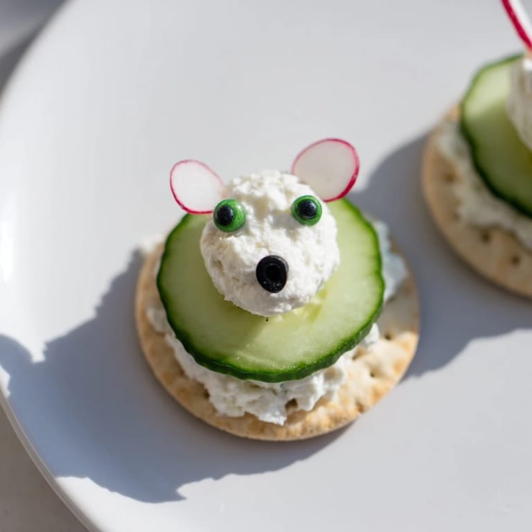 - Vegetables: 12 small cucumber slices (about ½ cm thick, cut into rounds), 12 small black olive slices (for noses), 24 mini capers (for eyes), 12 small radish slices (for ears)