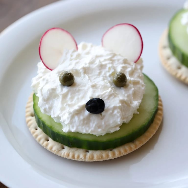 - Using a small spoon or piping bag, drop a rounded mound of cream cheese mixture onto the cucumber slice as the polar bears head.