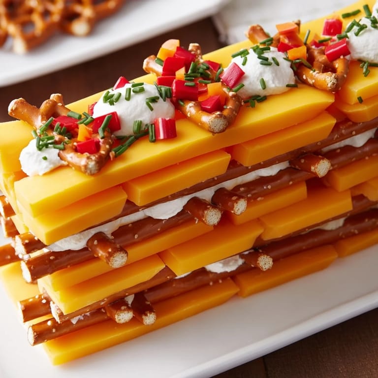 - Continue this alternating pattern—cheese, pretzels, cheese, pretzels—until you have 4 to 5 layers of height. You'll feel the structure grow beneath your hands, and it's oddly satisfying. Make sure each layer is snug against the others.