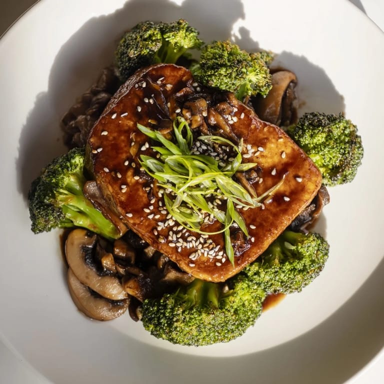 This dish features golden, pan-seared tofu steaks accompanied by tender broccoli florets and earthy shiitake mushrooms. The vegetables are lightly sautéed to retain their crispness, then combined with a rich soy-garlic sauce infused with maple syrup, garlic, and fresh ginger. Toasted sesame seeds and sliced green onions add a flavorful garnish. Quick to prepare and perfect for an easy, plant-based main.
