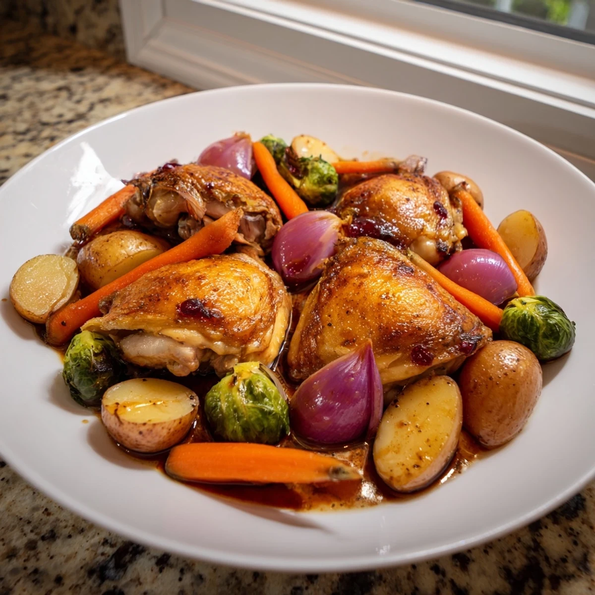 - Vegetables: 2 cups baby potatoes halved, 2 cups Brussels sprouts halved, 1 large red onion cut into wedges, 2 carrots peeled and sliced, 1 tablespoon olive oil, ½ teaspoon salt, ½ teaspoon black pepper