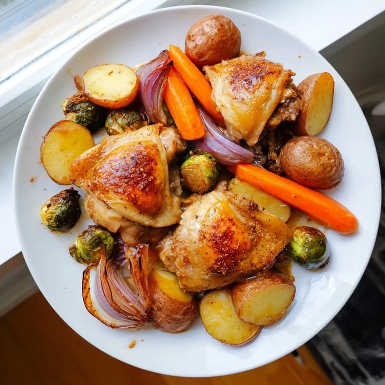 - Arrange the vegetables evenly on the prepared sheet pan. Nestle the chicken thighs among the vegetables, skin-side up.