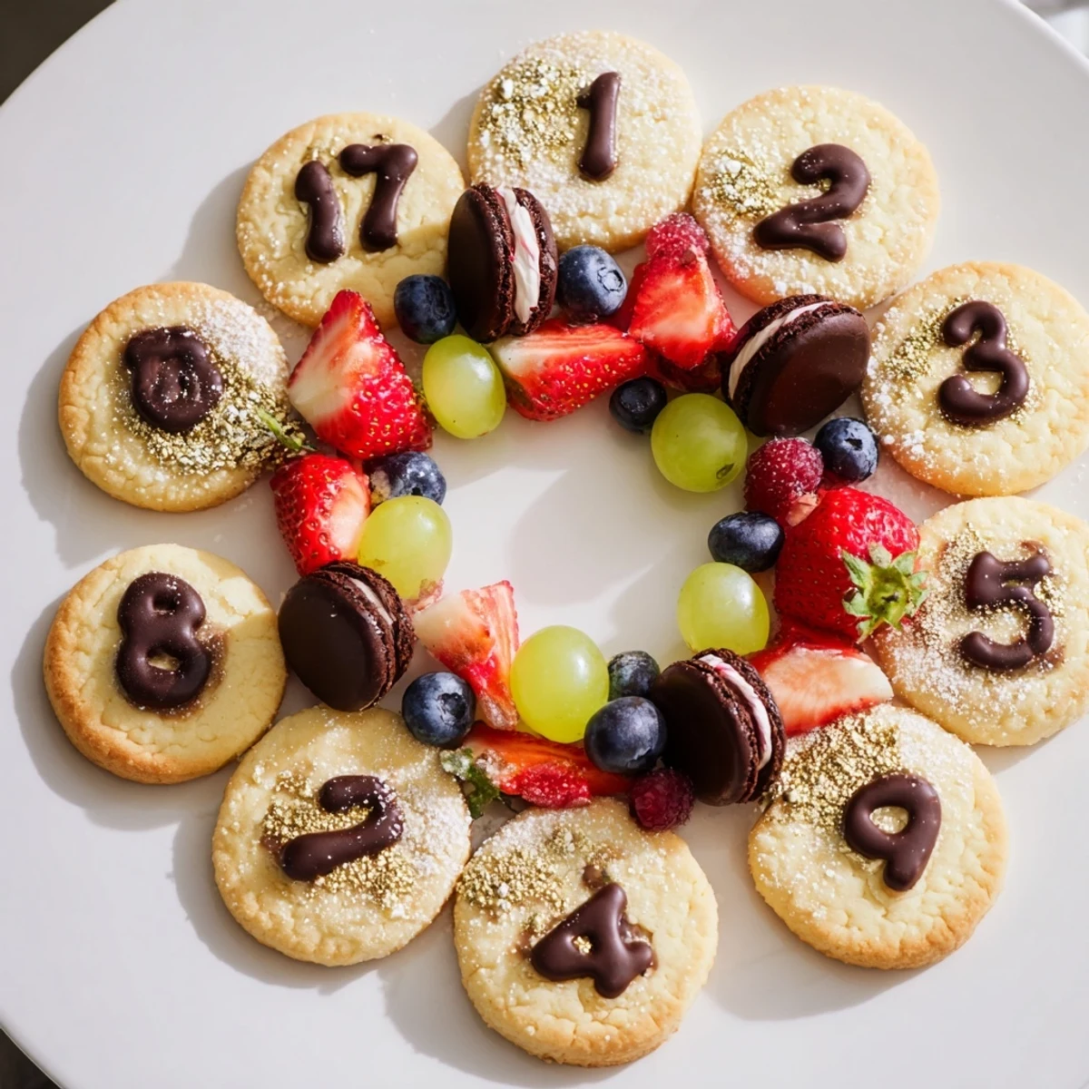 Arrange the round cookies evenly to form a clock face, place pastries between them, center fresh fruits inside, and decorate with sparkling elements and dips around.