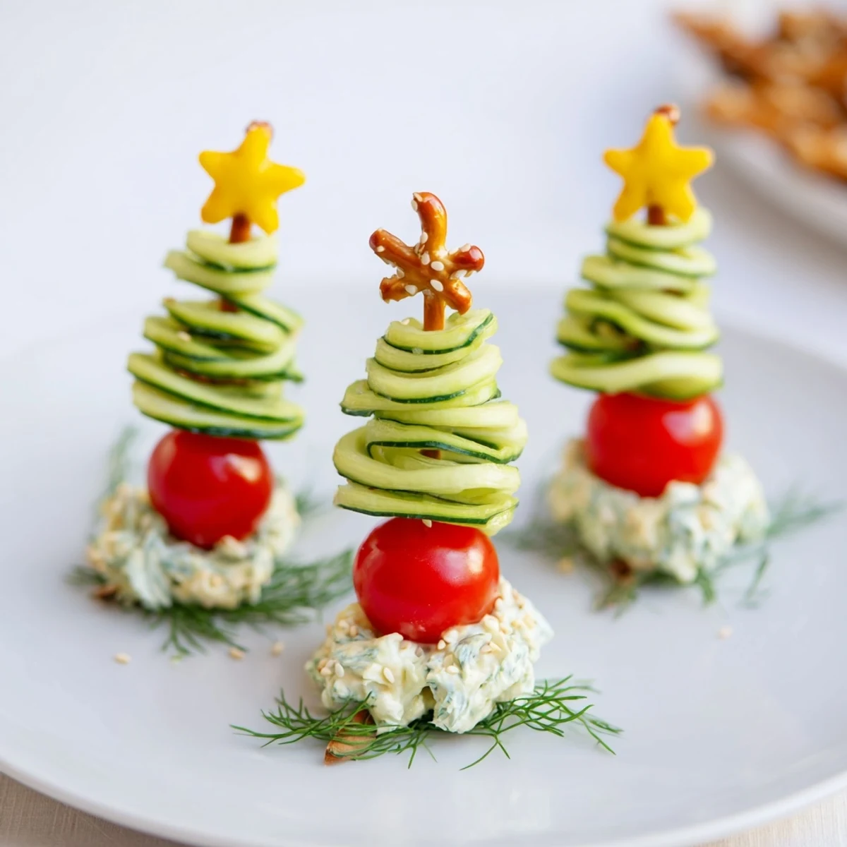 Save Celebrate the holiday season with these charming Spiral Cucumber Ribbon Christmas Trees, a refreshing and festive appetizer that's as delightful to look at as it is to eat. Crisp cucumber ribbons are artfully folded around pretzel sticks to mimic Christmas trees, adorned with smooth, herbed cream cheese, vibrant cherry tomatoes, and fresh dill and chives for a burst of flavor. Perfect for entertaining, this vegetarian and gluten-free starter brings a touch of whimsy and cheer to your holiday party table.