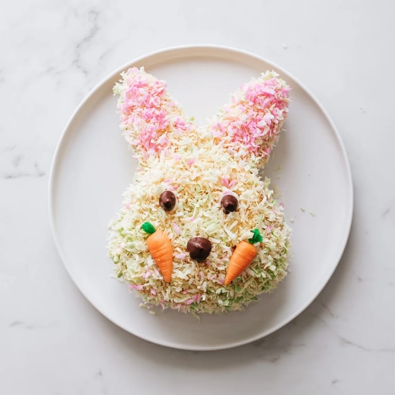 Shredded coconut is sprinkled over the frosting to mimic bunny fur, with some tinted pink for ears and nose details.