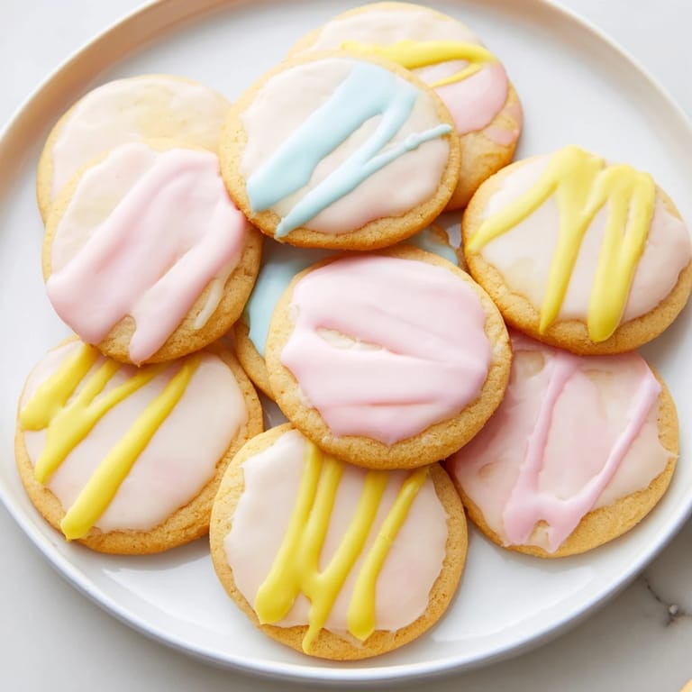 Save A delightful dessert featuring buttery sugar cookies topped with a sweet, colorful icing drizzle—perfect for any occasion.
