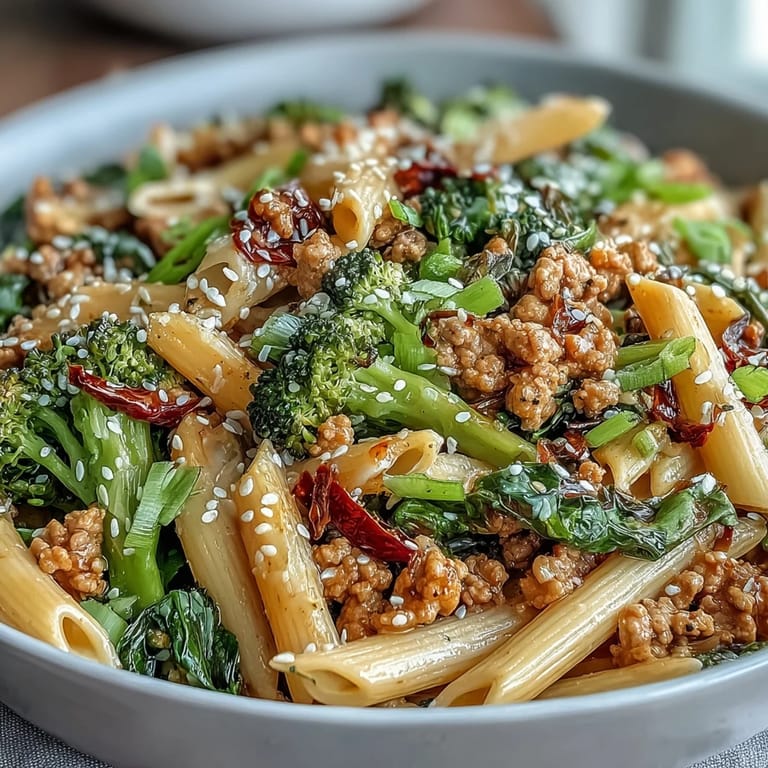 Most weeknight pasta feels like a compromise—you want it fast but also good, satisfying but also healthy. This dish doesn't ask you to choose. The ground turkey brings protein without the weight of beef, the broccoli stays green and crisp instead of turning sad and mushy, and the sauce is complex enough that you're not bored by bite three. The heat builds gradually instead of punching you immediately, which means you can adjust to what you like without drowning everything in sriracha.