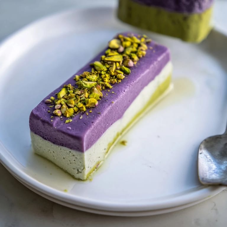 Save Creamy, vibrant ice cream bars featuring sweet ube and nutty pistachio, layered for a delightful contrast in flavor and color. Perfect for a refreshing summer dessert or an impressive treat for gatherings.
