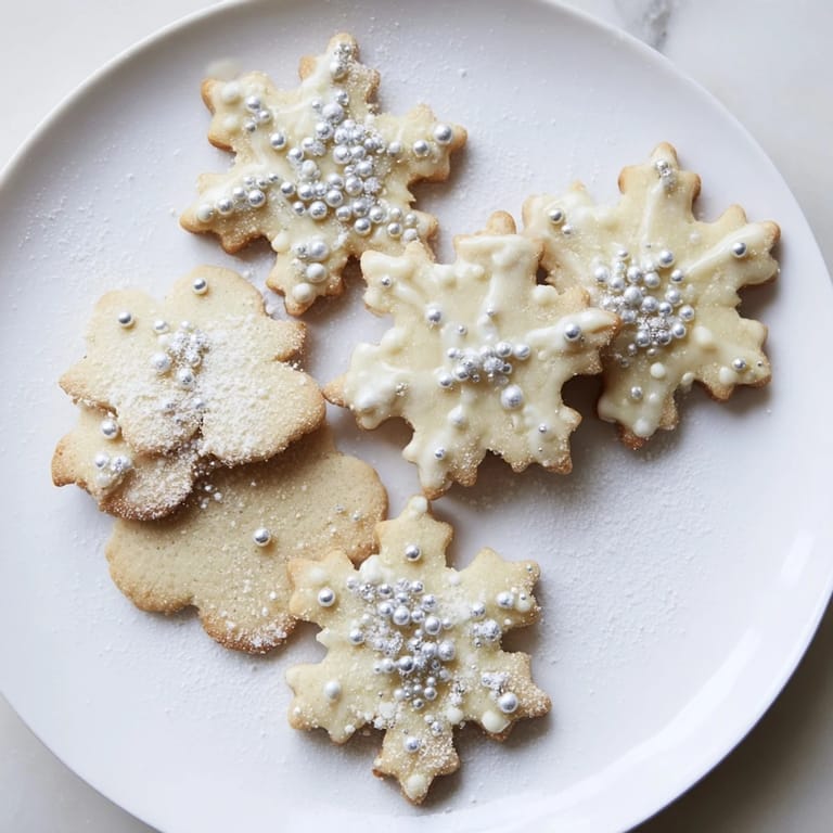 Melted white chocolate is drizzled or dipped onto cooled cookies, then sprinkled with silver sugar pearls or white sprinkles and dusted with icing sugar.