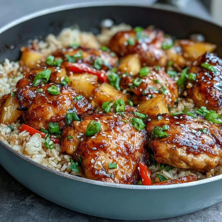 For best results, use a large skillet with a tight-fitting lid to ensure even cooking and proper steam retention. Rinsing the rice before cooking removes excess starch and prevents the dish from becoming gummy. When browning the chicken, resist the urge to move it around too much—letting it sit allows a nice golden crust to form. If using canned pineapple, reserve the juice for the sauce to maximize the tropical flavor. For a glossy finish, drizzle a little extra sesame oil over the finished dish just before serving.